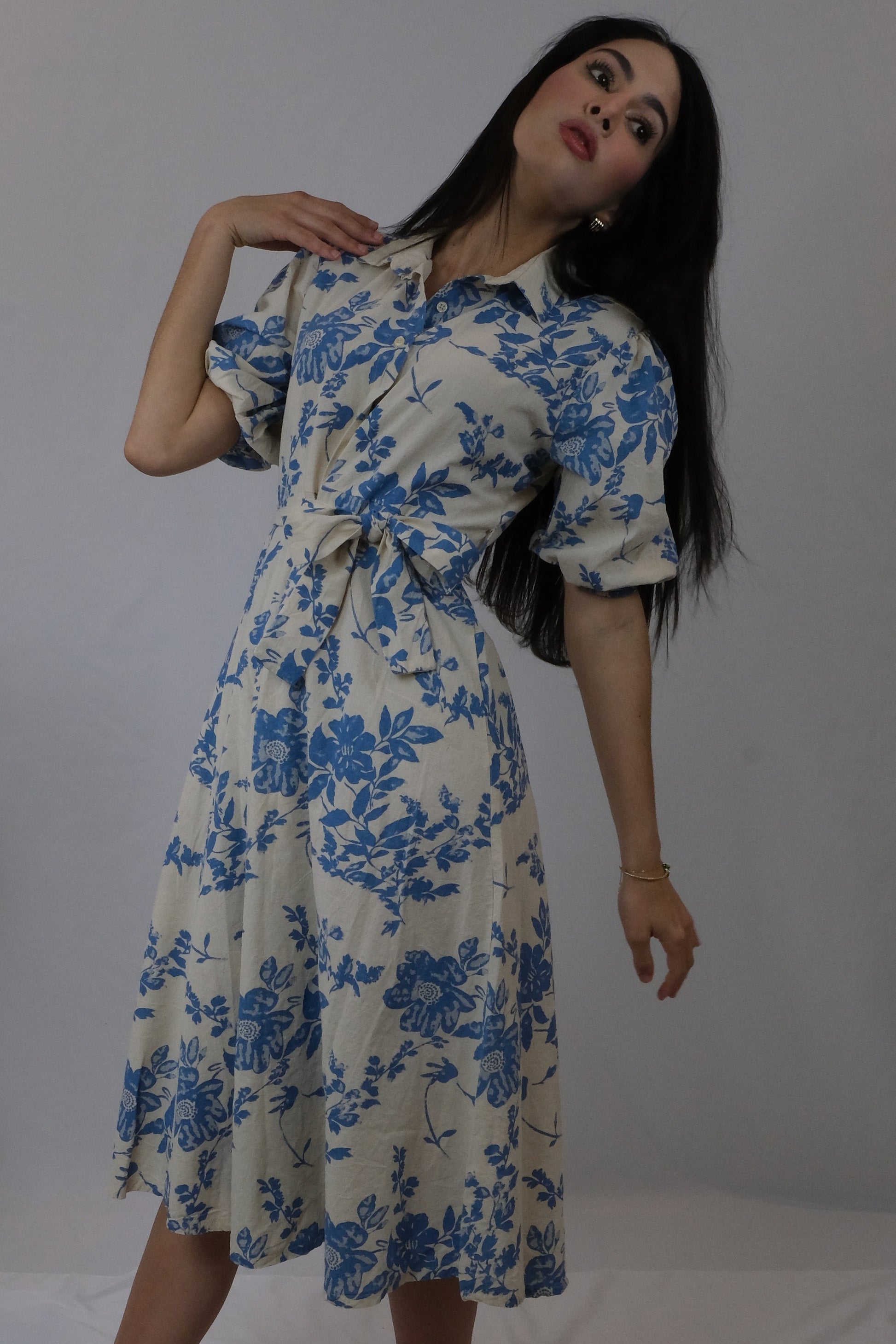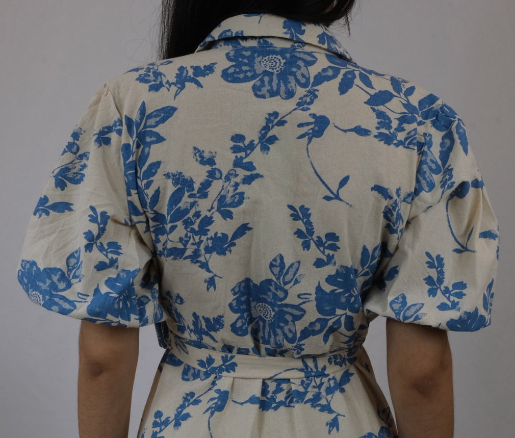 Blue and cream floral midi dress crafted from lightweight woven fabric. Designed with a button-front closure, short puff sleeves, and a self-tie waist belt that defines the silhouette. A feminine and versatile piece ideal for everyday wear and elevated casual occasions.
